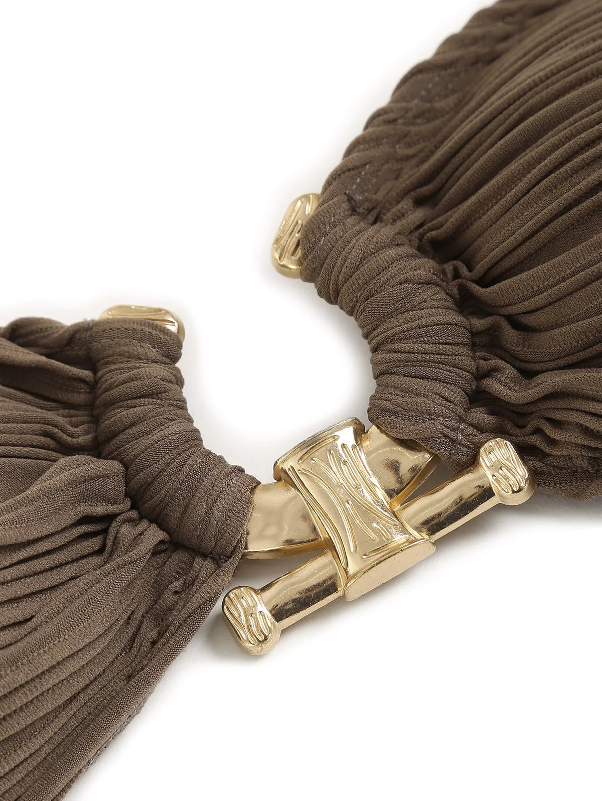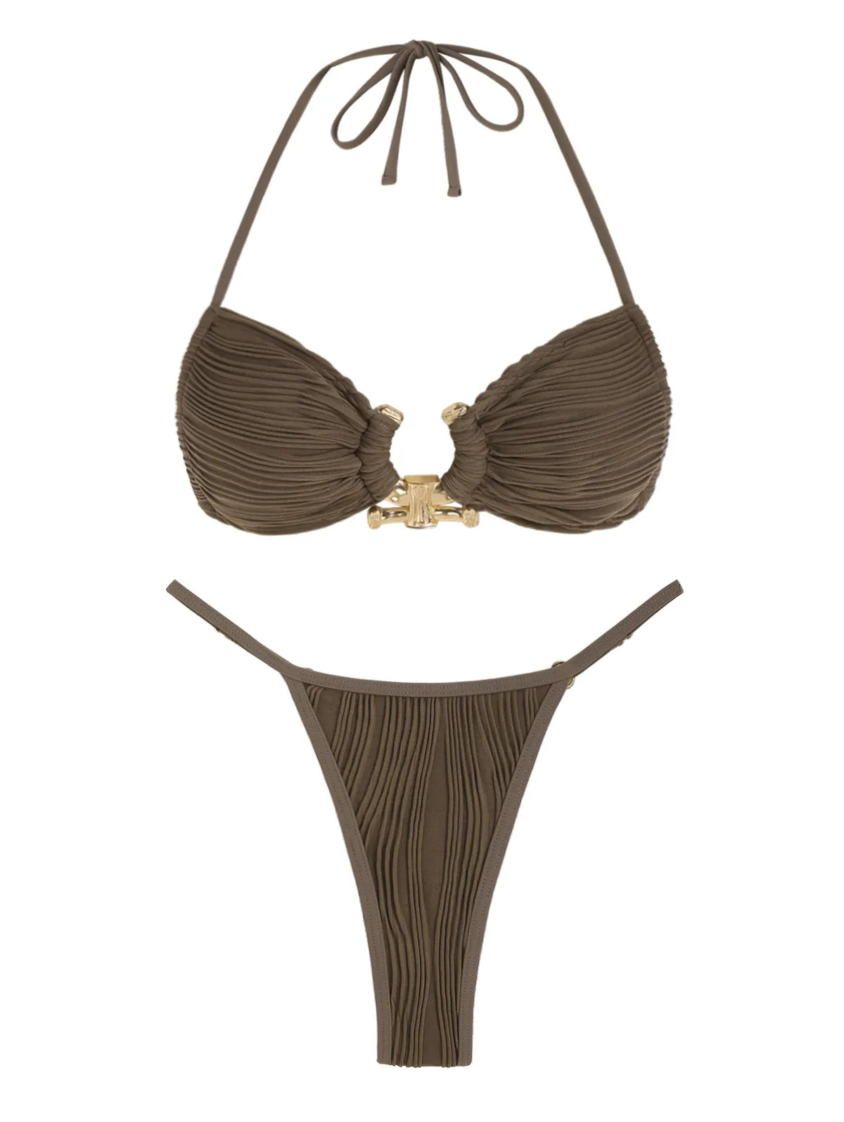 Um biquíni texturizado, cheio de recortes e detalhes metálicos, feito para você se sentir poderosa e confiante em qualquer cenário de praia ou piscina.