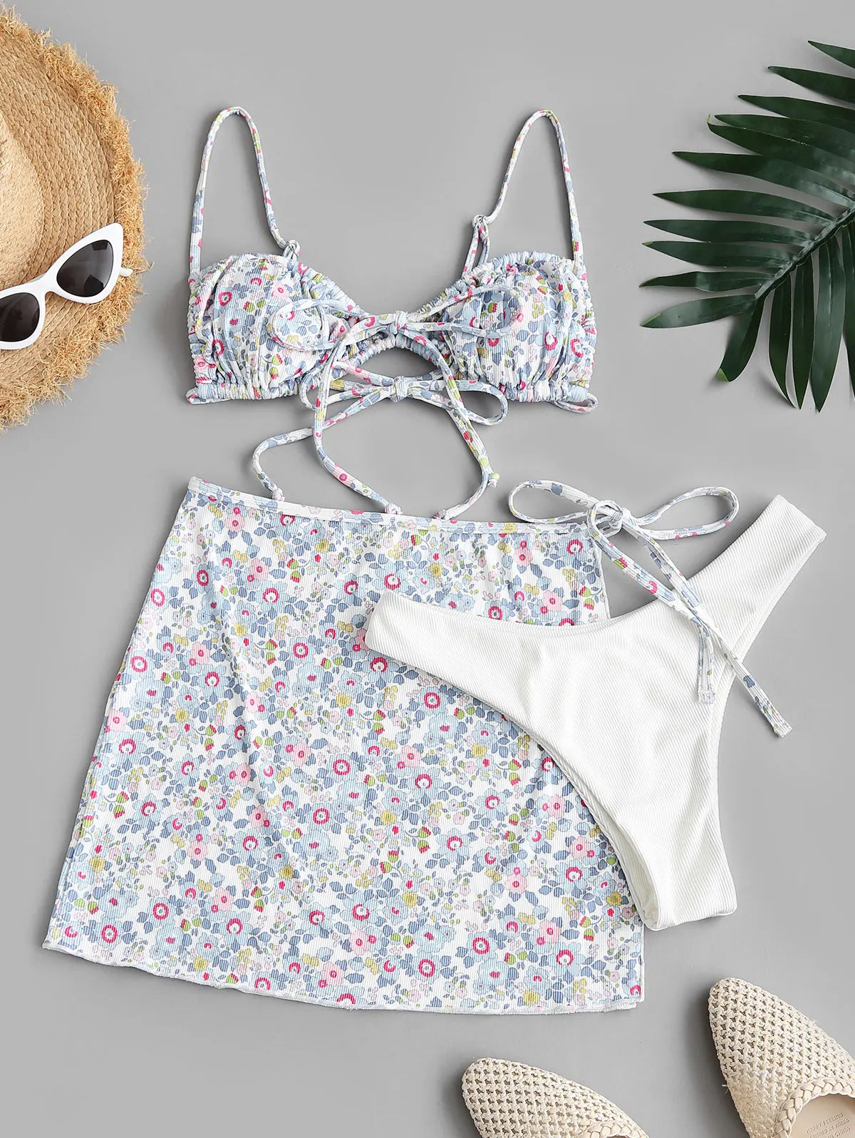 Se você quer um biquíni versátil, que permita vários jeitos de usar e ainda tenha estampa fofa, esse conjunto de três peças floral canelado da ZAFUL é ideal.
