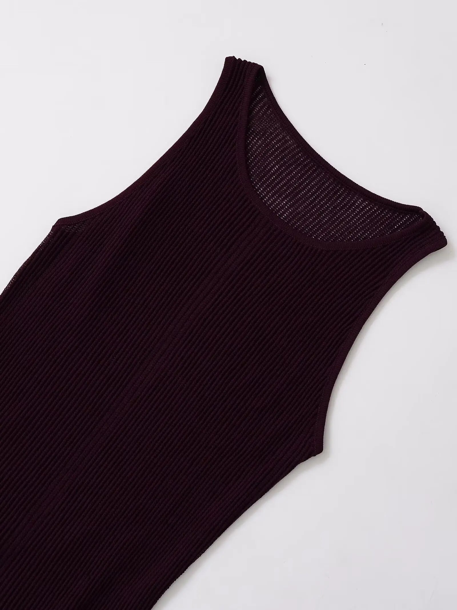 Vestido longo feminino canelado, sem mangas, com gola redonda, elegante – lançamentos de verão 2025