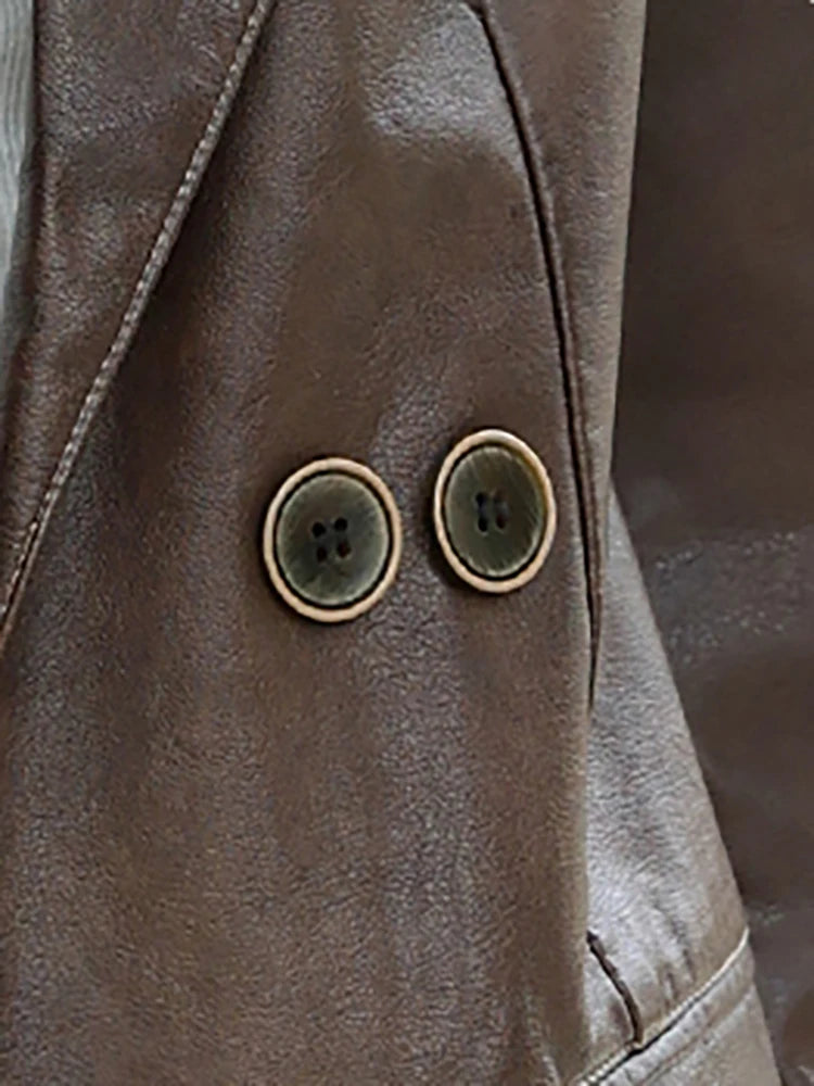 Com um corte moderno e levemente oversized , possui Gola Lapela e fechamento com Botão Único , oferecendo uma silhueta alongada e sofisticada. O material em Couro PU de alta qualidade garante um acabamento estiloso e com brilho sutil, ideal para elevar instantaneamente seu visual casual chique .