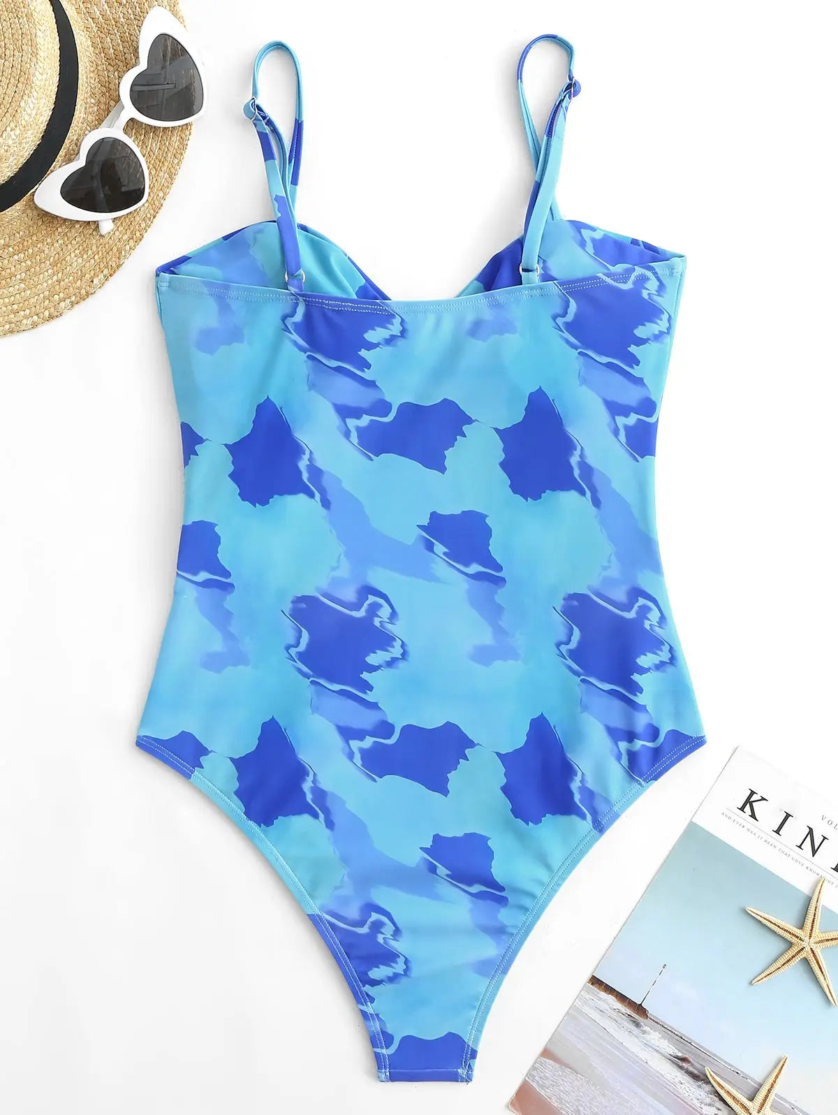 Maiô cavado tie‑dye com recortes e cintura alta.